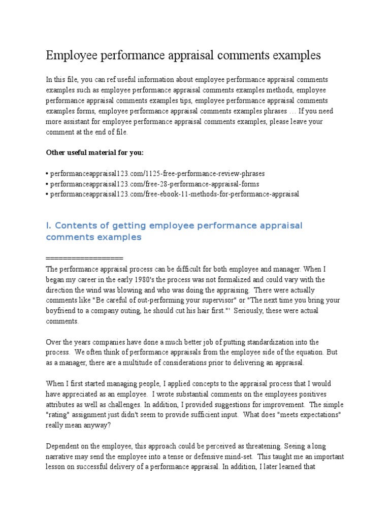 Performance Appraisal Employee Comments Sample Performance Appraisal Employment